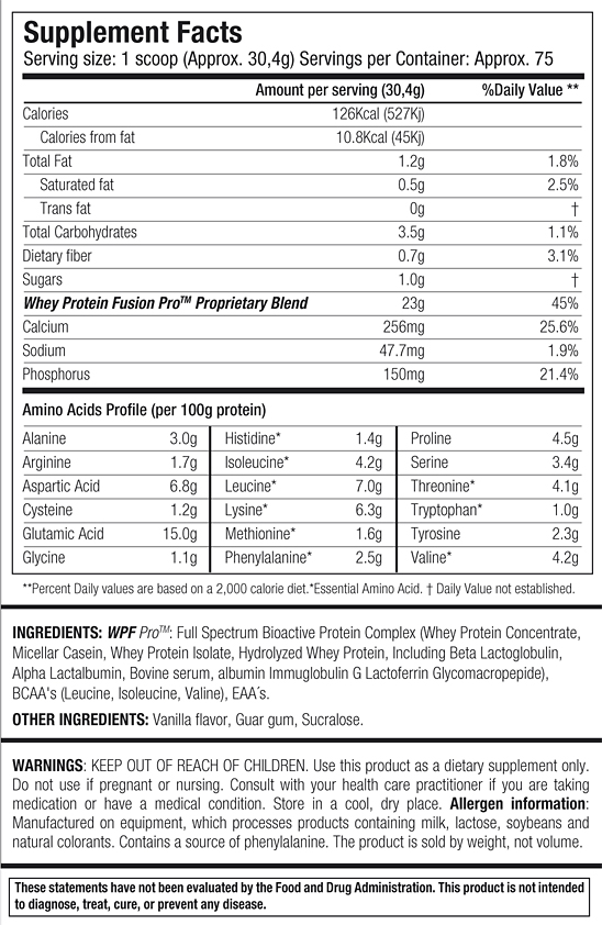 W100 Whey Protein incluye la excelente cantidad de 38,5 gramos de proteína de la máxima calidad por servicio y menos de 1 gramo de grasa.